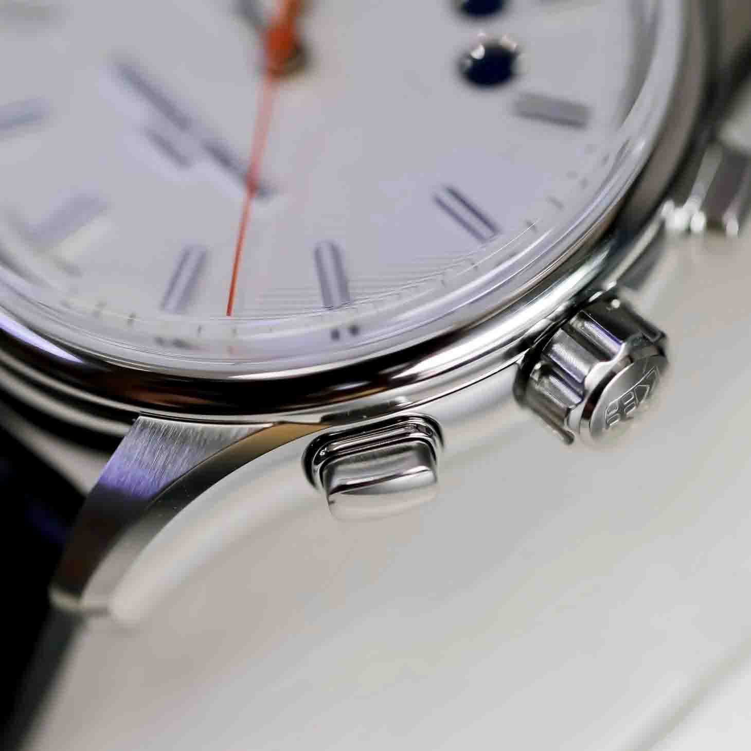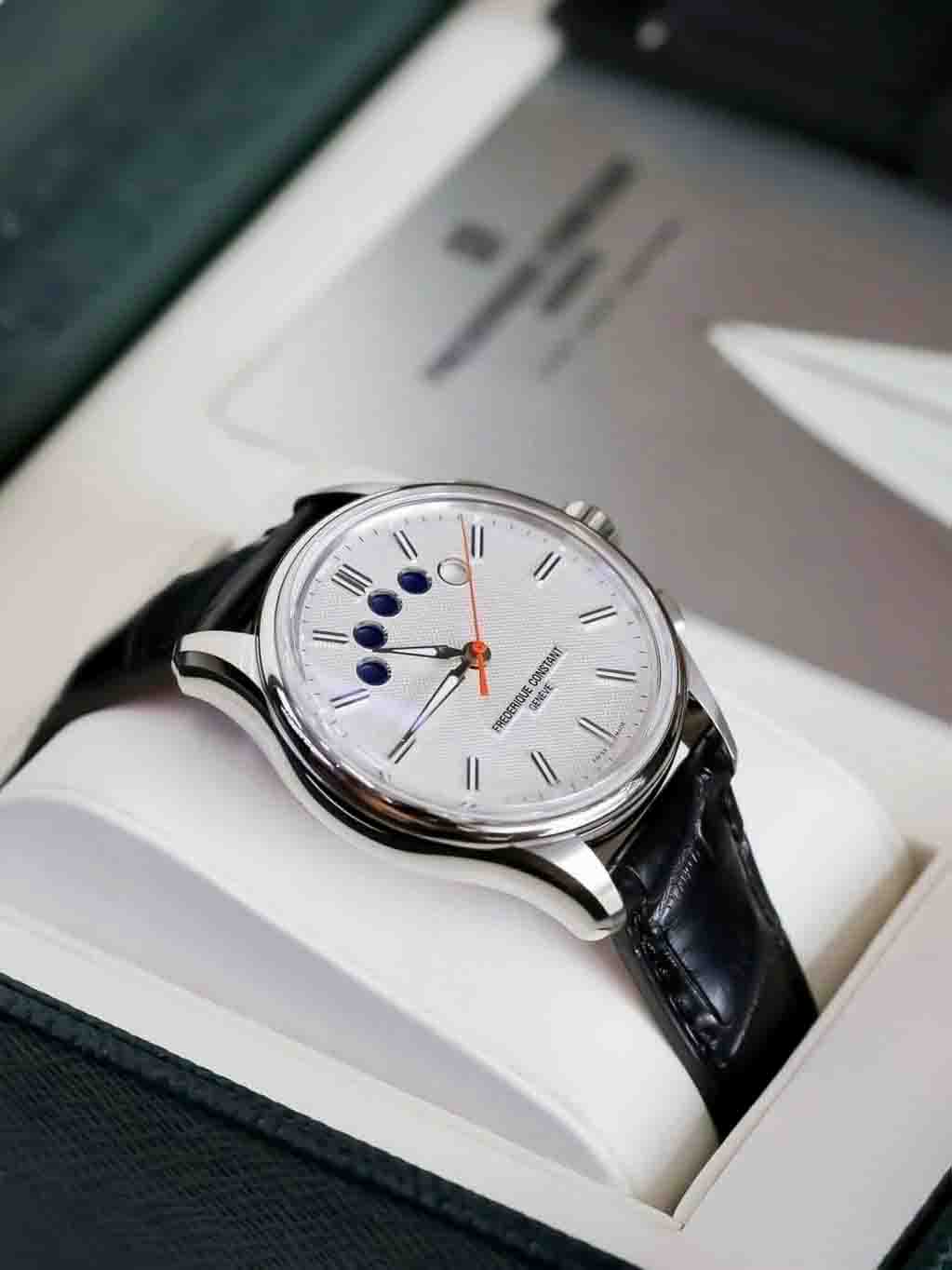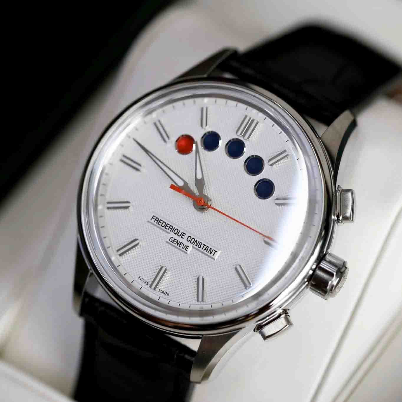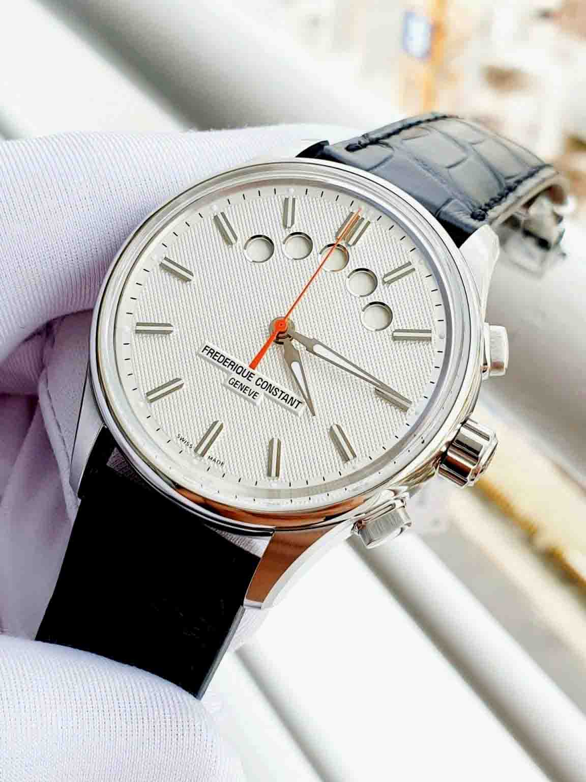 – Máy FC-380 (based SW500) với cơ chế Chronograph độc đáo hiển thị tại 5 chấm tròn trên mặt đồng hồ, 25 chân kính, 48h tích cót & 28800 vph