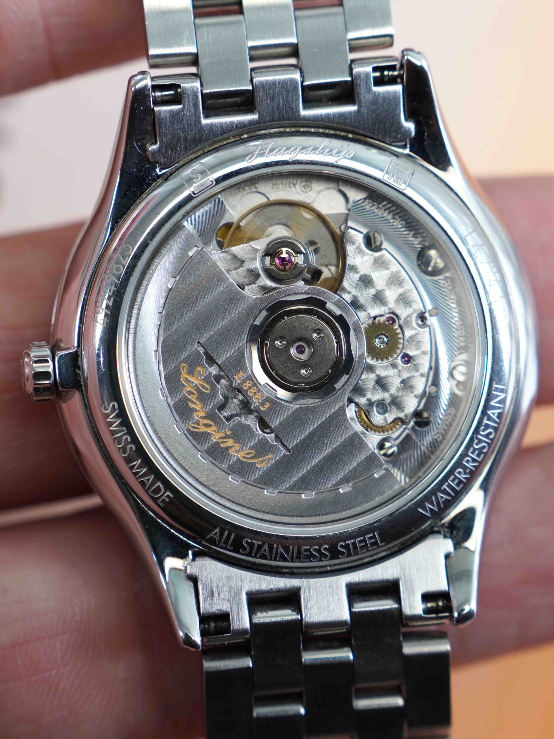 – Bộ truyền động Longines L888.3 (based ETA) với 21 chân kính, 25200 vph & 64h tích cót