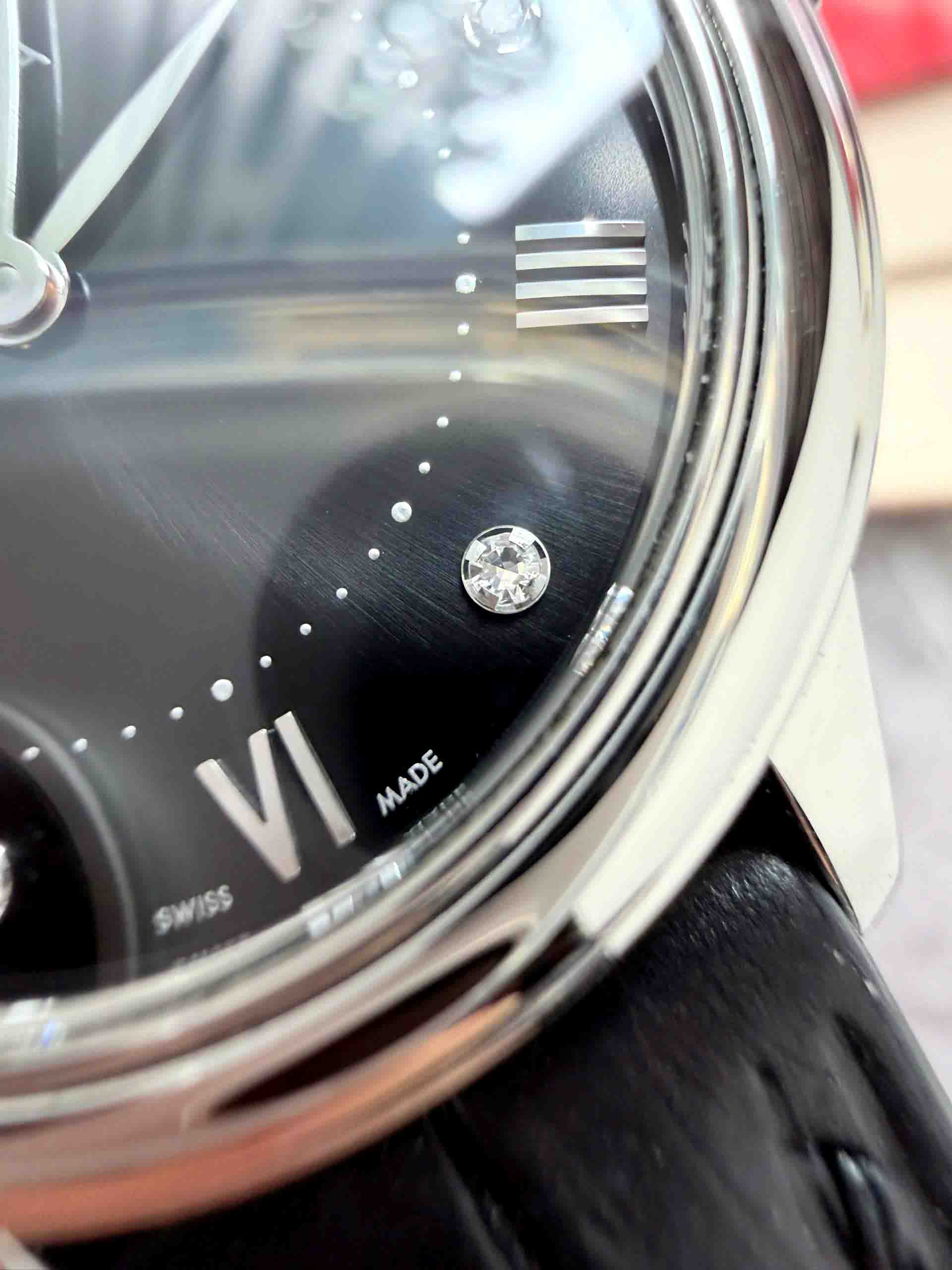 • Điểm nhấn kim cương: 6 viên kim cương lấp lánh đan xen cùng các chữ số La Mã cổ điển, tôn vinh nét đẹp quyền quý.