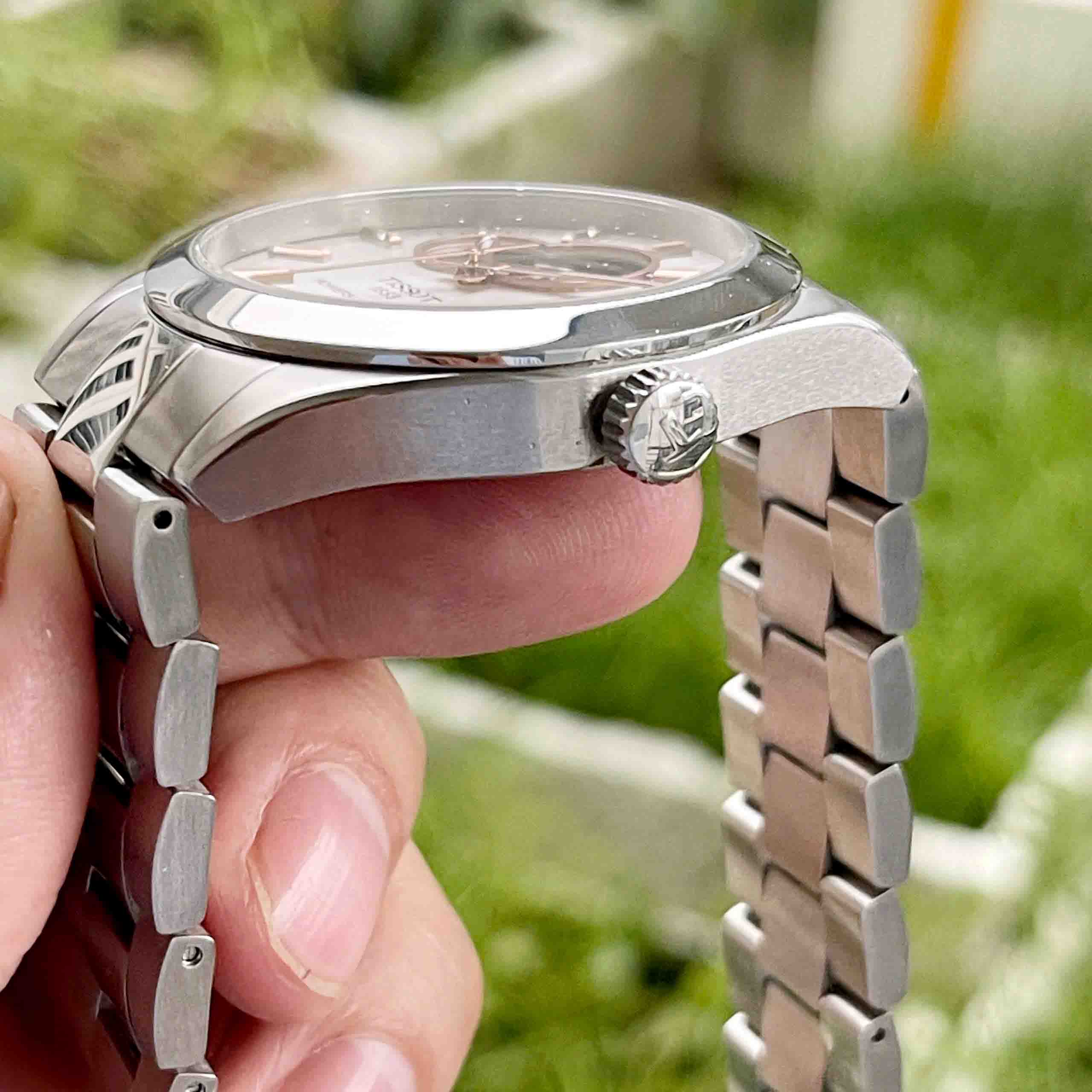 Thiết kế dial trắng chải tia , kim cọc vàng hồng nổi bật